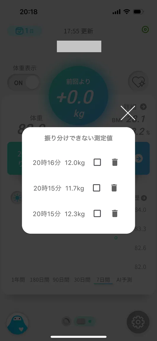 ちなみに、issinスマートバスマットは他の人が乗ってイレギュラーな値が出ると下図のように振り分けできない数値が表示されます。こちらは子供が乗ったところのデータです。