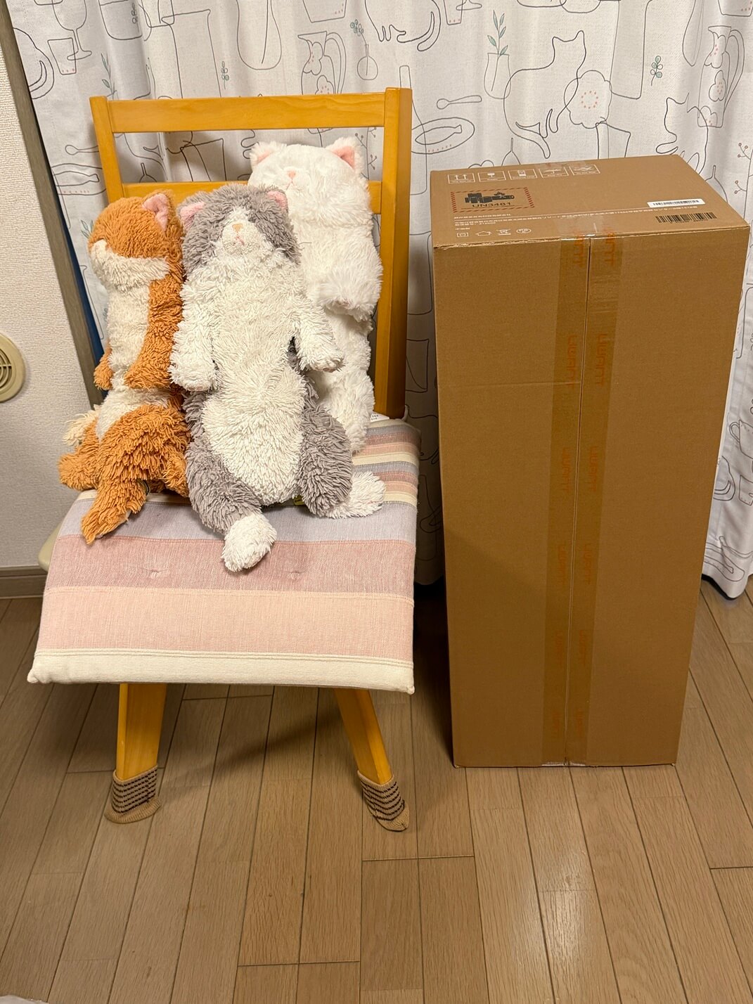 こちらはV500梱包ダンボールの大きさを比較するために撮影。イスとサイズが同じくらい大きいダンボールでした。