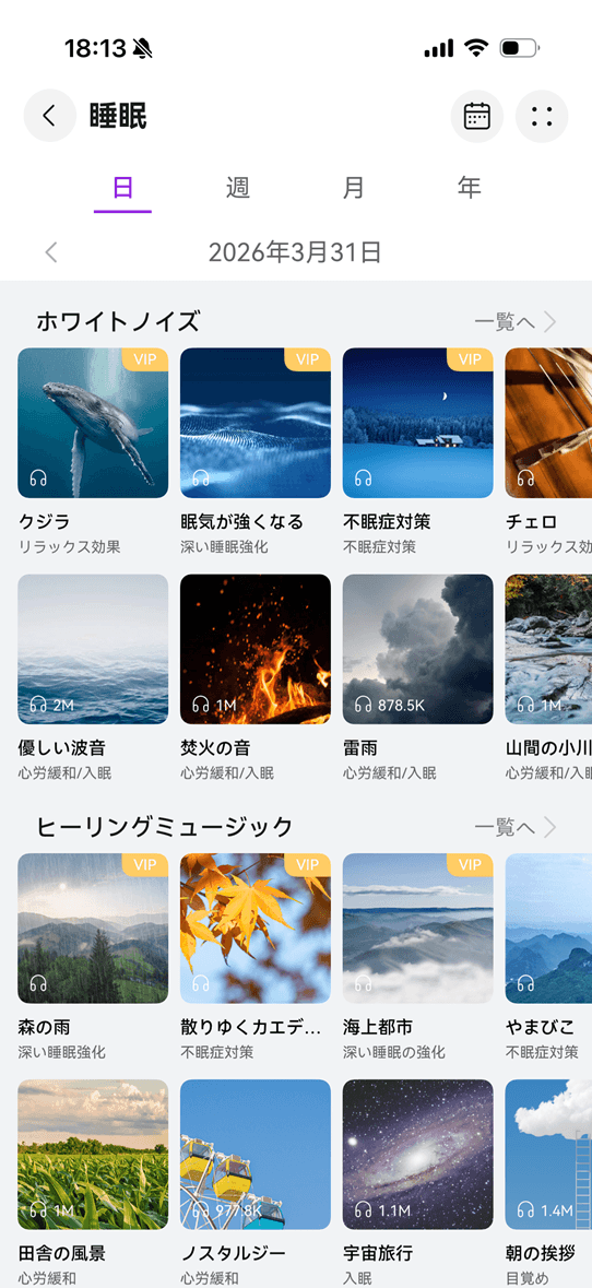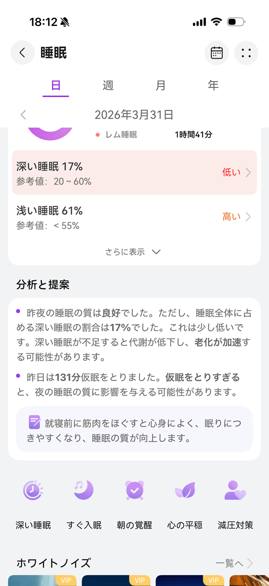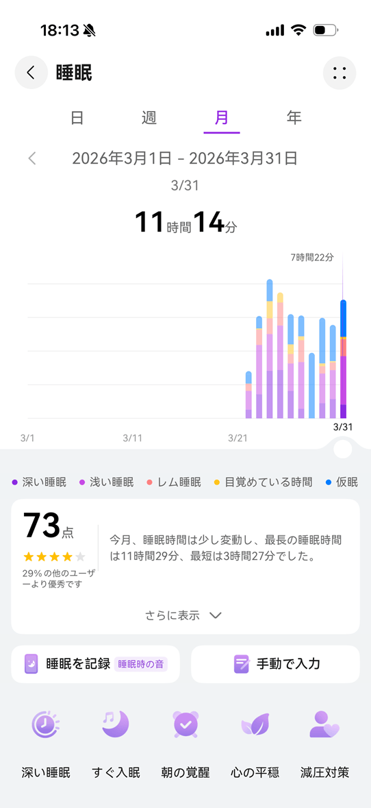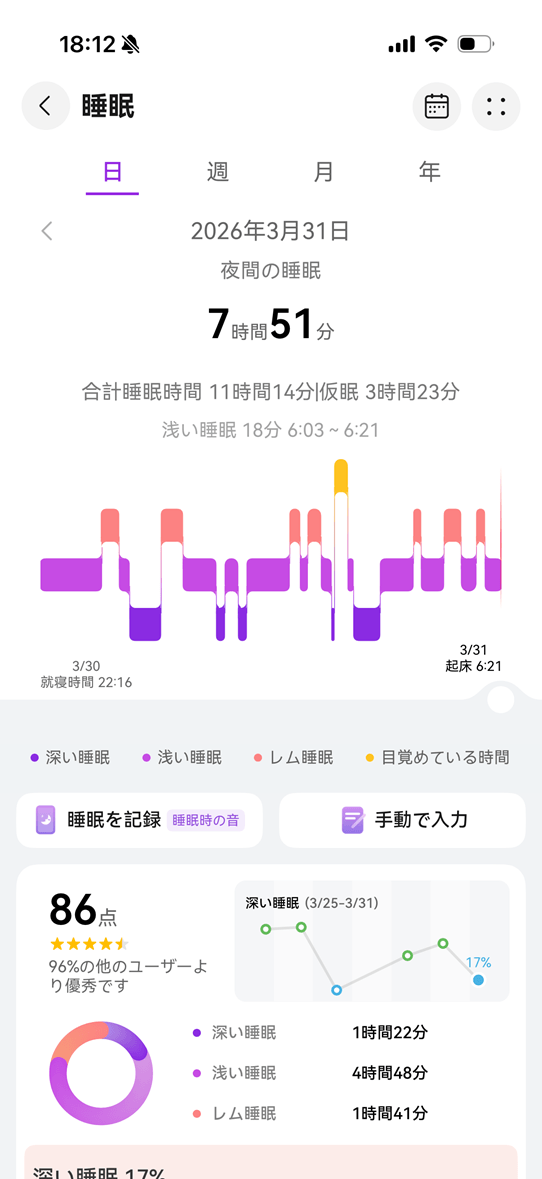 深い睡眠やレム睡眠の時間が細かく記録され、自分の睡眠の質がひと目でわかります。